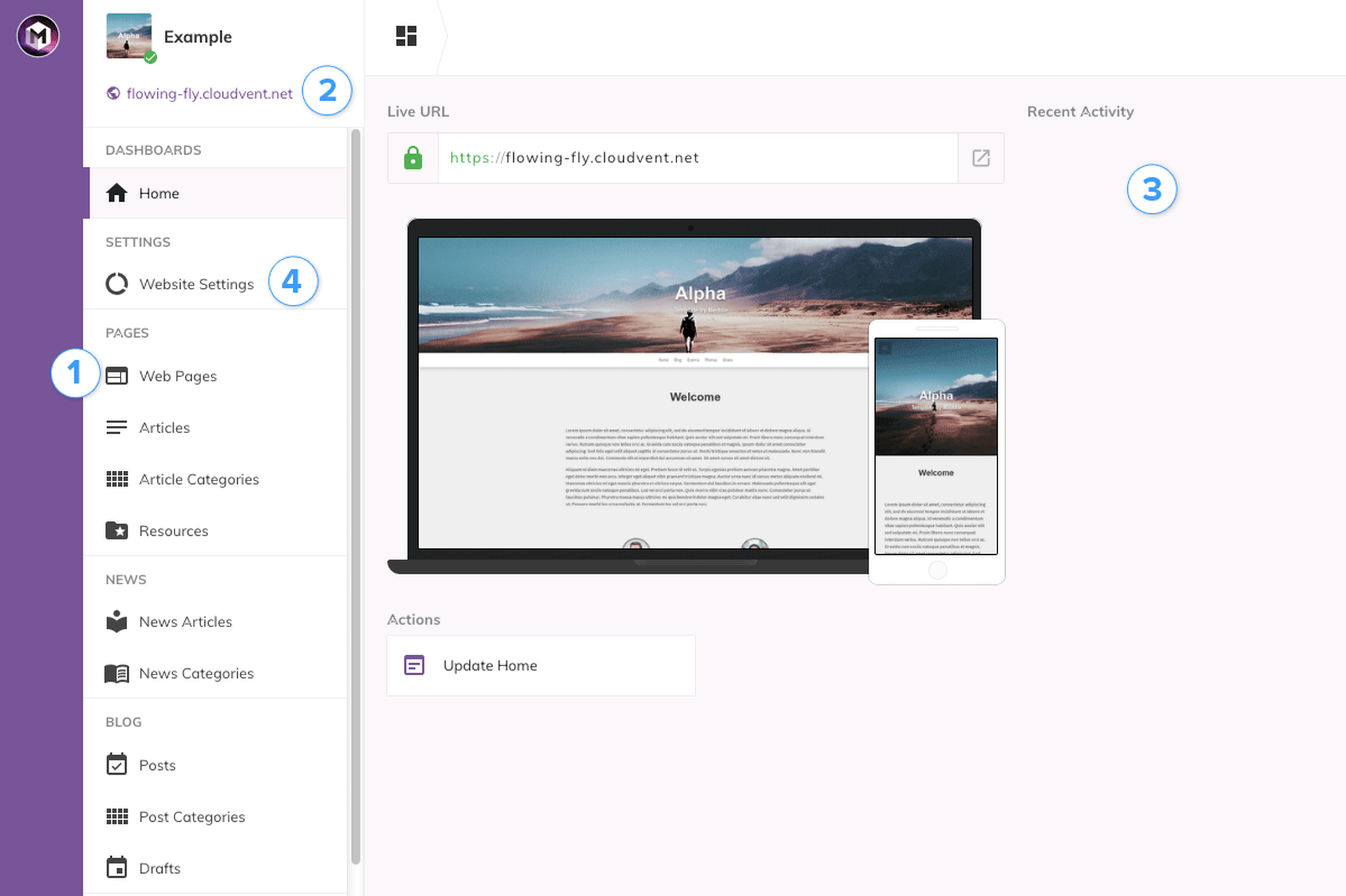 The Recent Activity column shows all recent changes and updates to your website. You may occasionally see updates from Meddle staff, these are for making necessary updates to themes etc. so you're running the latest versions.
