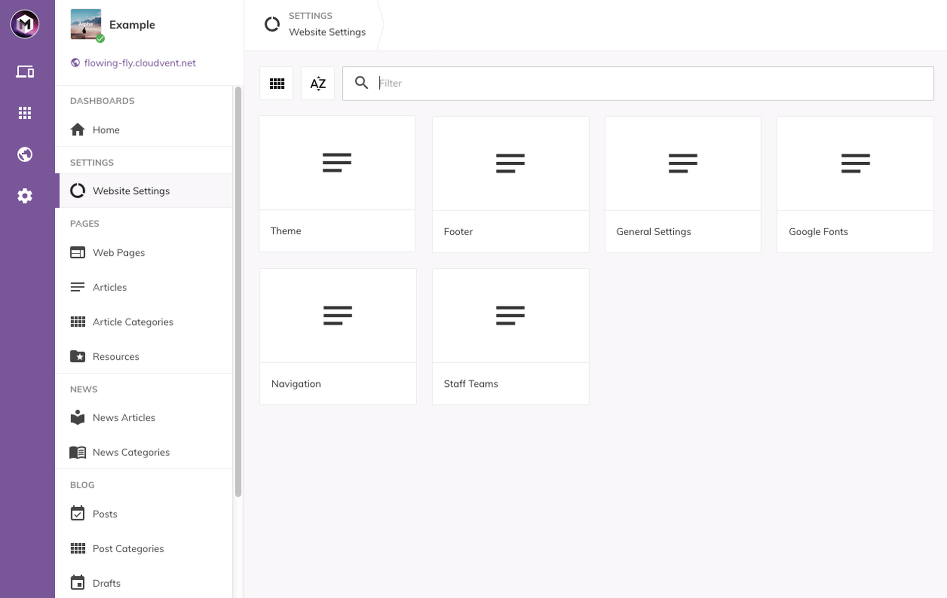 The 'Website Settings' section is where you can manage themes, fonts, search engine optimisation, navigation and other general settings.